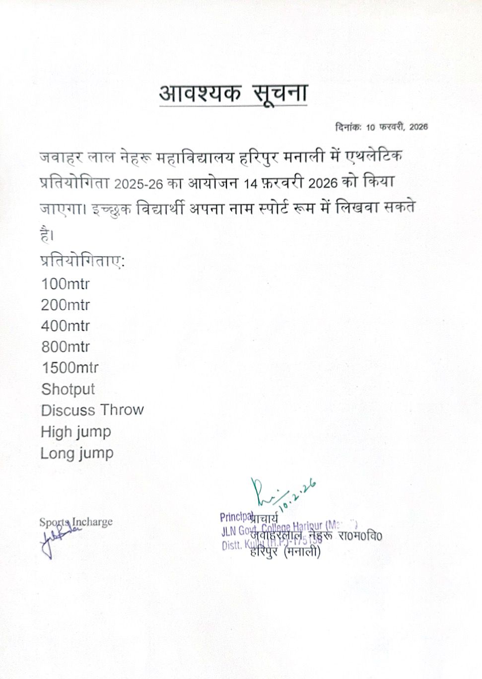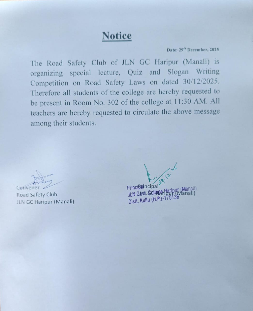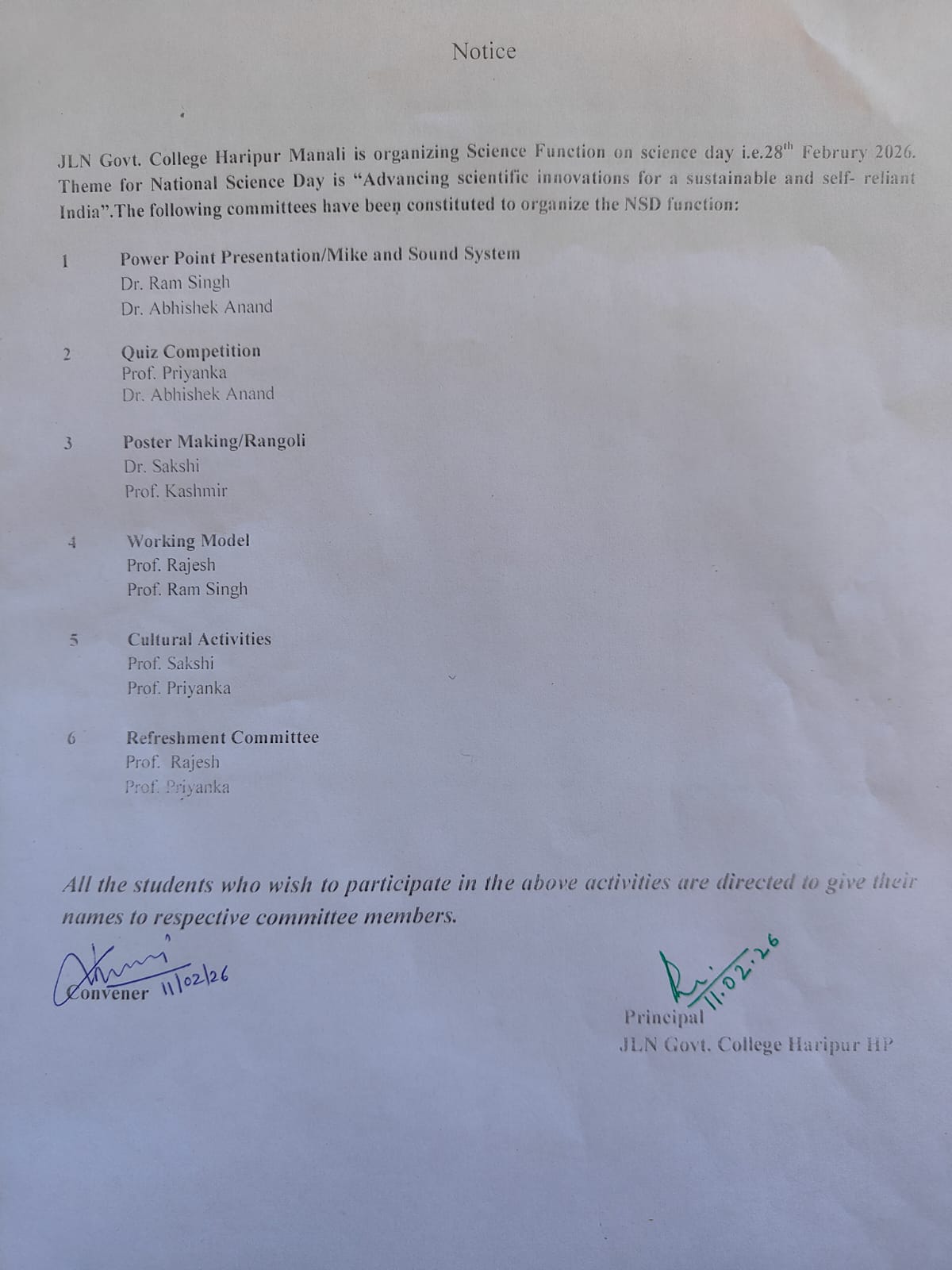 I am delighted to extend a warm welcome to each of you as you embark on this exciting higher education journey at JLN Govt. College Haripur, Manali. Your admission marks a significant milestone, and we are thrilled to have you as part of our vibrant academic community. We are committed to fostering an environment that encourages academic excellence, personal growth, and the development of lifelong skills. Our dedicated faculty and staff are here to support and guide you every step of the way, ensuring that you have the resources and opportunities needed to succeed. As you begin this new chapter, I encourage you to take full advantage of the diverse programs, activities, and resources available to you. Engage in your studies with enthusiasm, participate in extracurricular activities, and seek out new experiences that will broaden your horizons and enrich your college experience. A complete bouquet of curricular and co-curricular activities; like participation in sports and games, cultural activities, declamation contests, quiz competitions, career counselling and guidance, NSS, NCC, Rovers & Rangers and participation in various clubs and societies will make this process of learning more enriching and help in your all-round development. Remember, college is not just about acquiring knowledge but also about building character, forming lasting friendships, and discovering your passions. Embrace challenges with resilience, stay curious, and never hesitate to ask for help when needed.