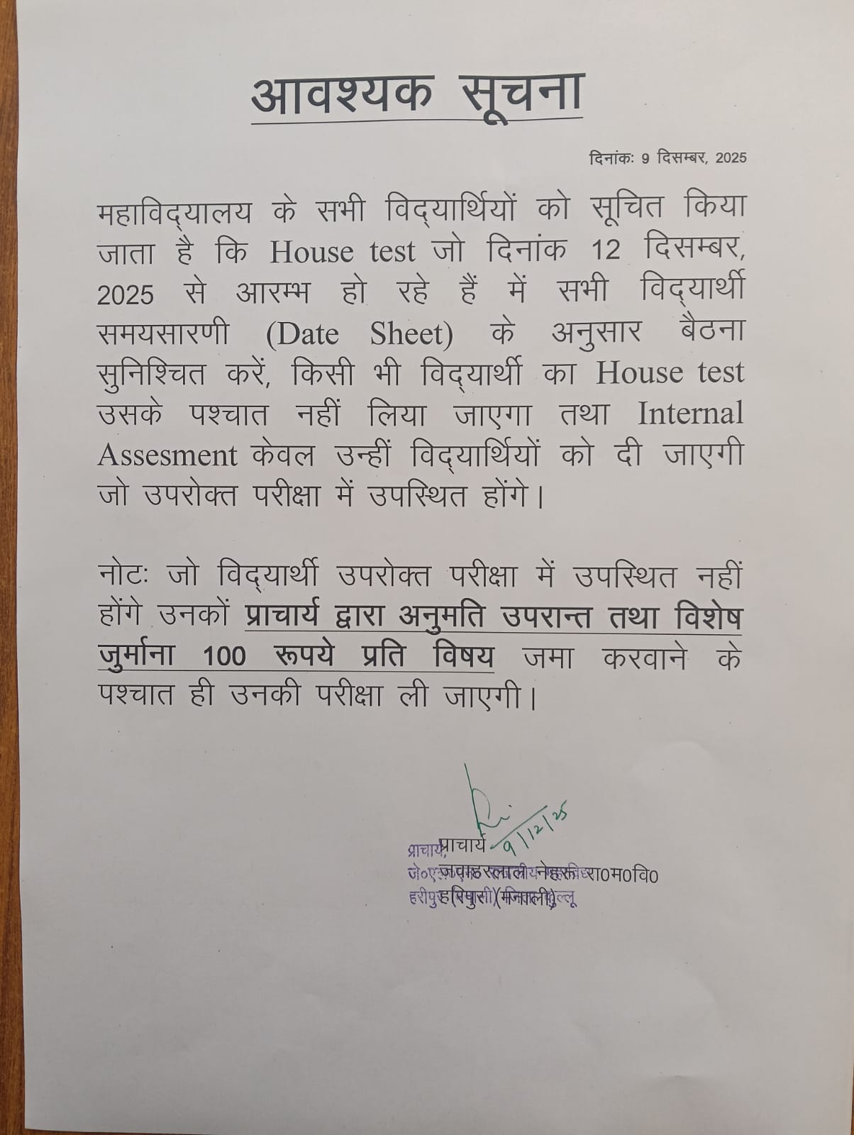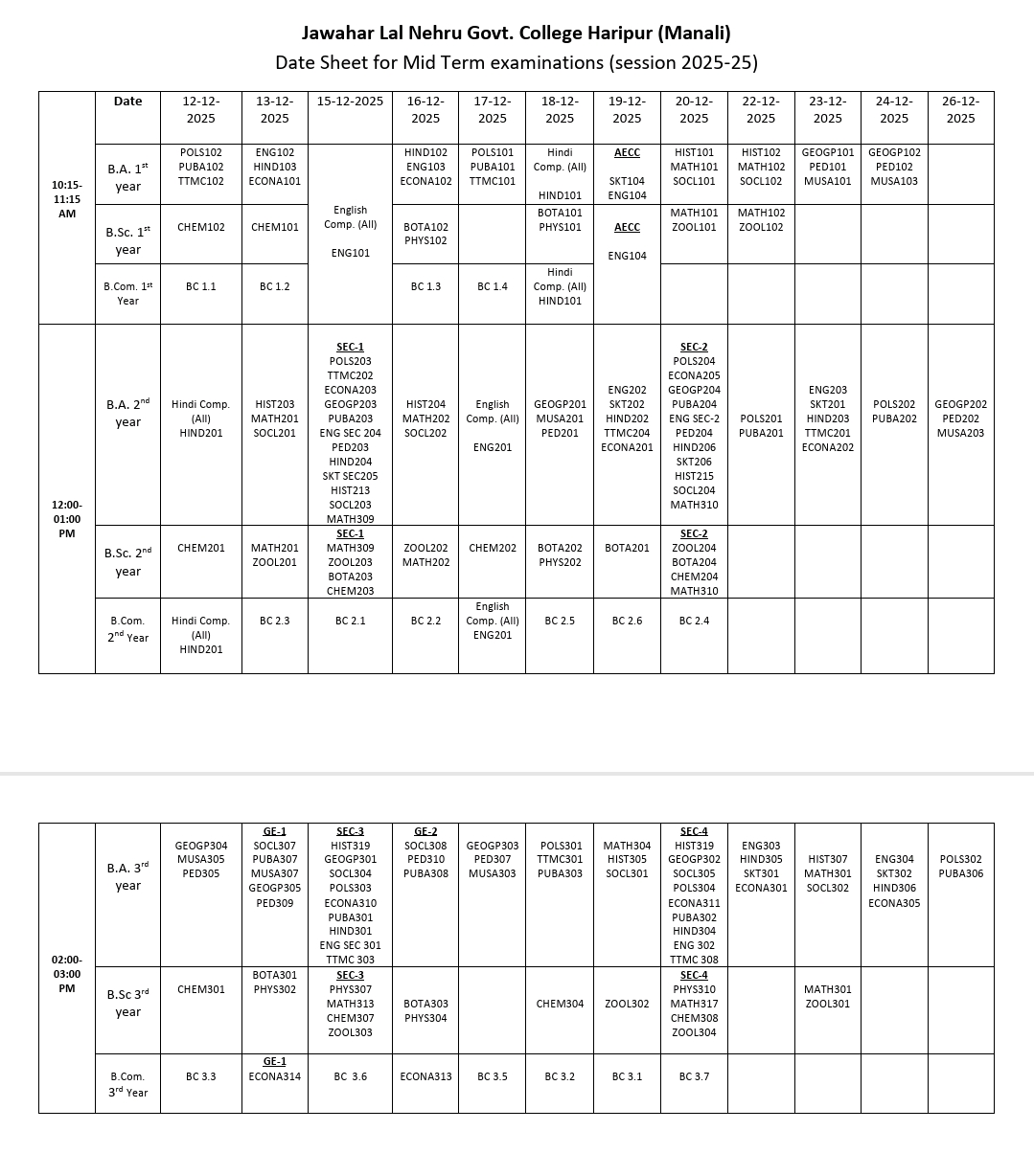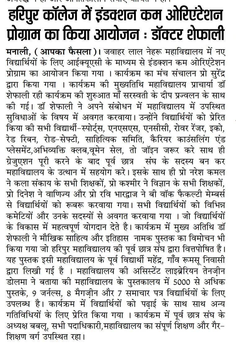 I am delighted to extend a warm welcome to each of you as you embark on this exciting higher education journey at JLN Govt. College Haripur, Manali. Your admission marks a significant milestone, and we are thrilled to have you as part of our vibrant academic community. We are committed to fostering an environment that encourages academic excellence, personal growth, and the development of lifelong skills. Our dedicated faculty and staff are here to support and guide you every step of the way, ensuring that you have the resources and opportunities needed to succeed. As you begin this new chapter, I encourage you to take full advantage of the diverse programs, activities, and resources available to you. Engage in your studies with enthusiasm, participate in extracurricular activities, and seek out new experiences that will broaden your horizons and enrich your college experience. A complete bouquet of curricular and co-curricular activities; like participation in sports and games, cultural activities, declamation contests, quiz competitions, career counselling and guidance, NSS, NCC, Rovers & Rangers and participation in various clubs and societies will make this process of learning more enriching and help in your all-round development. Remember, college is not just about acquiring knowledge but also about building character, forming lasting friendships, and discovering your passions. Embrace challenges with resilience, stay curious, and never hesitate to ask for help when needed.