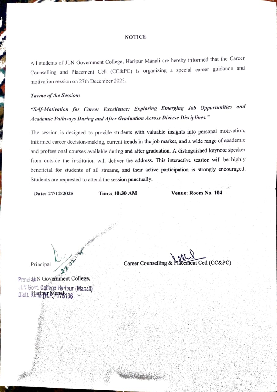 I am delighted to extend a warm welcome to each of you as you embark on this exciting higher education journey at JLN Govt. College Haripur, Manali. Your admission marks a significant milestone, and we are thrilled to have you as part of our vibrant academic community. We are committed to fostering an environment that encourages academic excellence, personal growth, and the development of lifelong skills. Our dedicated faculty and staff are here to support and guide you every step of the way, ensuring that you have the resources and opportunities needed to succeed. As you begin this new chapter, I encourage you to take full advantage of the diverse programs, activities, and resources available to you. Engage in your studies with enthusiasm, participate in extracurricular activities, and seek out new experiences that will broaden your horizons and enrich your college experience. A complete bouquet of curricular and co-curricular activities; like participation in sports and games, cultural activities, declamation contests, quiz competitions, career counselling and guidance, NSS, NCC, Rovers & Rangers and participation in various clubs and societies will make this process of learning more enriching and help in your all-round development. Remember, college is not just about acquiring knowledge but also about building character, forming lasting friendships, and discovering your passions. Embrace challenges with resilience, stay curious, and never hesitate to ask for help when needed.