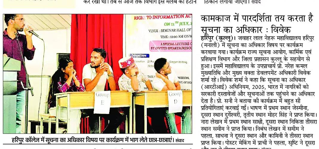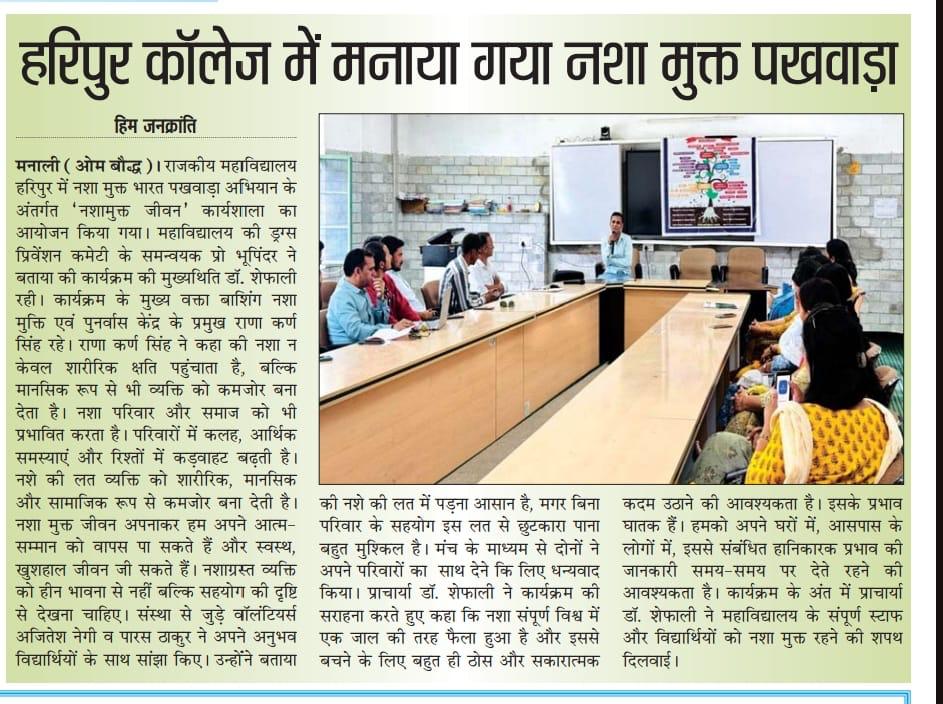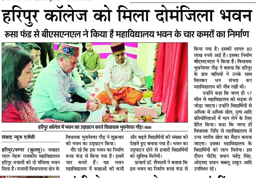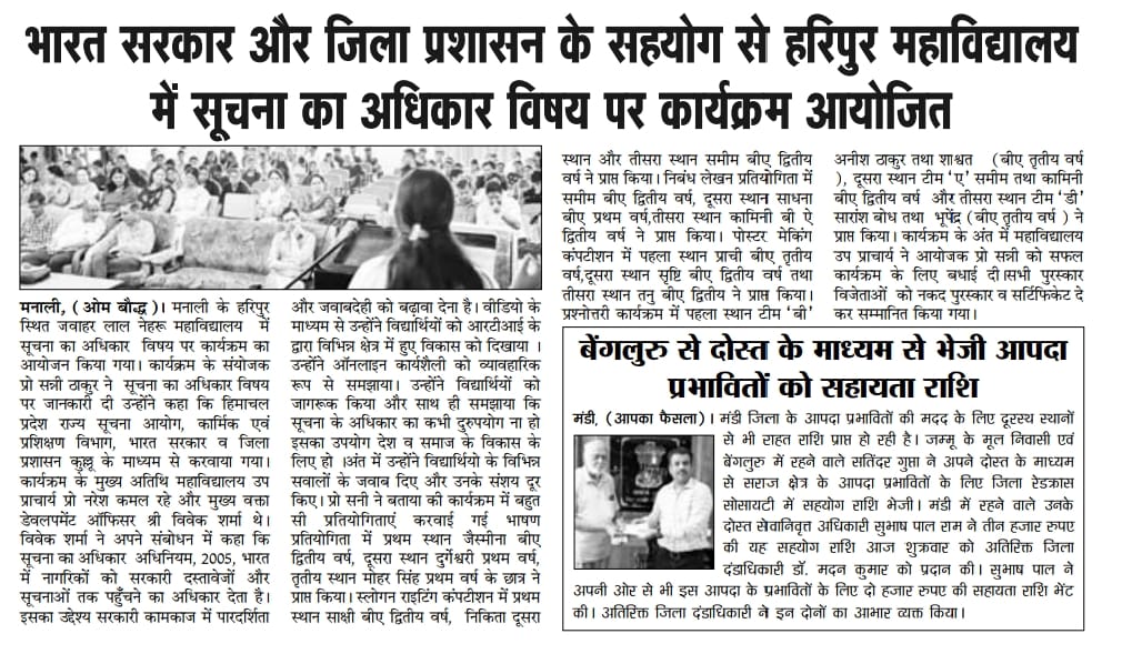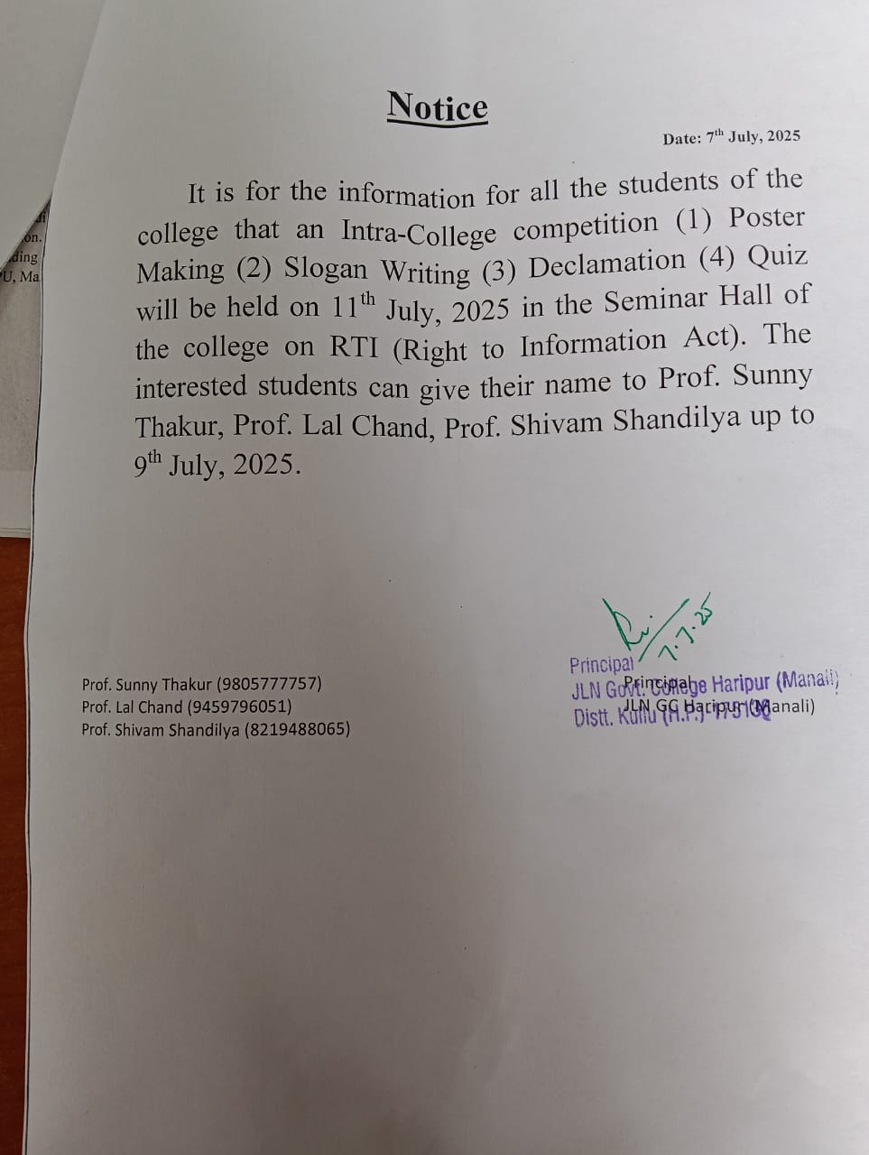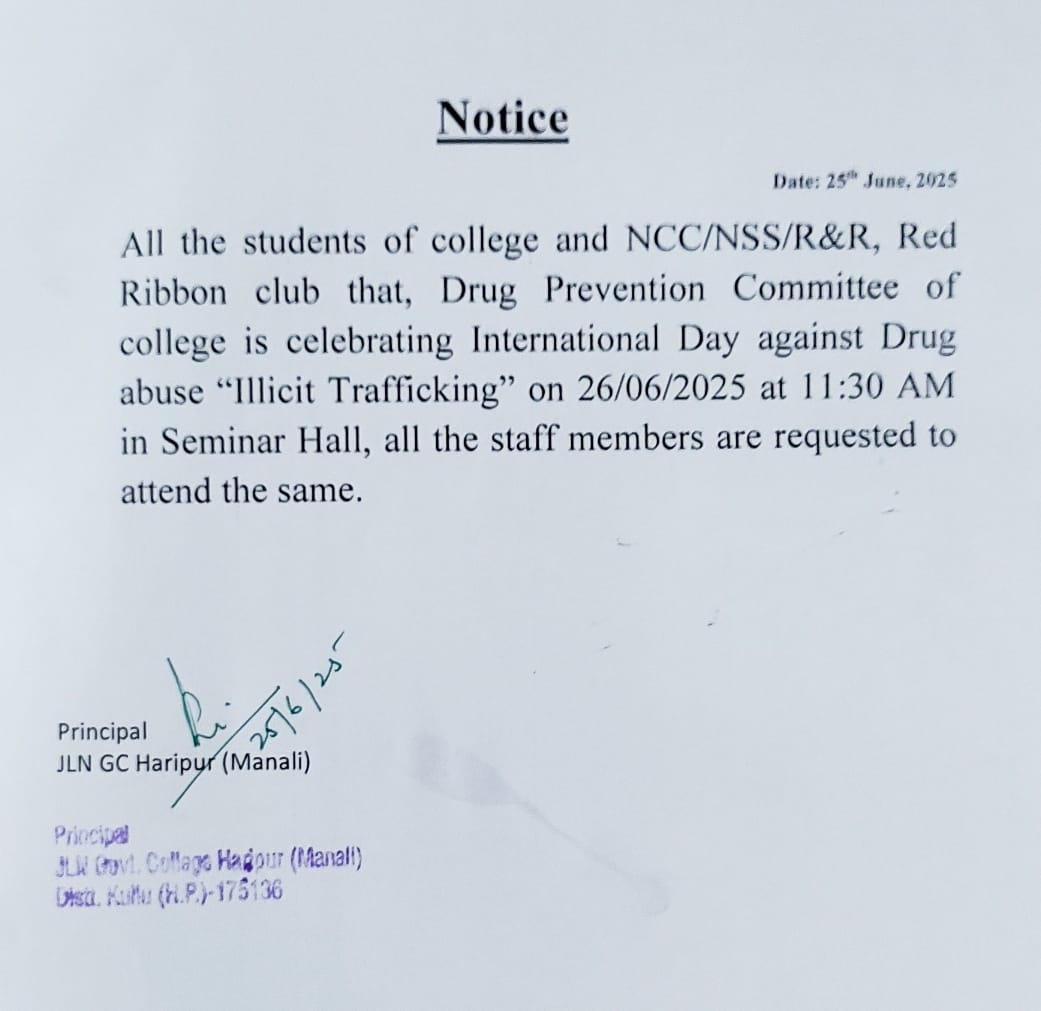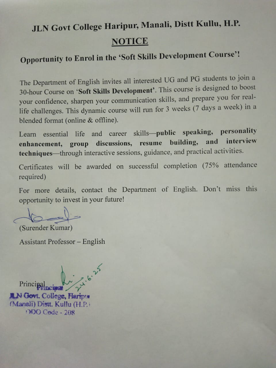 I am delighted to extend a warm welcome to each of you as you embark on this exciting higher education journey at JLN Govt. College Haripur, Manali. Your admission marks a significant milestone, and we are thrilled to have you as part of our vibrant academic community. We are committed to fostering an environment that encourages academic excellence, personal growth, and the development of lifelong skills. Our dedicated faculty and staff are here to support and guide you every step of the way, ensuring that you have the resources and opportunities needed to succeed. As you begin this new chapter, I encourage you to take full advantage of the diverse programs, activities, and resources available to you. Engage in your studies with enthusiasm, participate in extracurricular activities, and seek out new experiences that will broaden your horizons and enrich your college experience. A complete bouquet of curricular and co-curricular activities; like participation in sports and games, cultural activities, declamation contests, quiz competitions, career counselling and guidance, NSS, NCC, Rovers & Rangers and participation in various clubs and societies will make this process of learning more enriching and help in your all-round development. Remember, college is not just about acquiring knowledge but also about building character, forming lasting friendships, and discovering your passions. Embrace challenges with resilience, stay curious, and never hesitate to ask for help when needed.