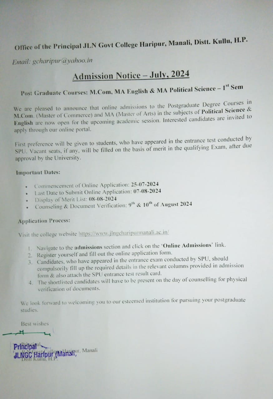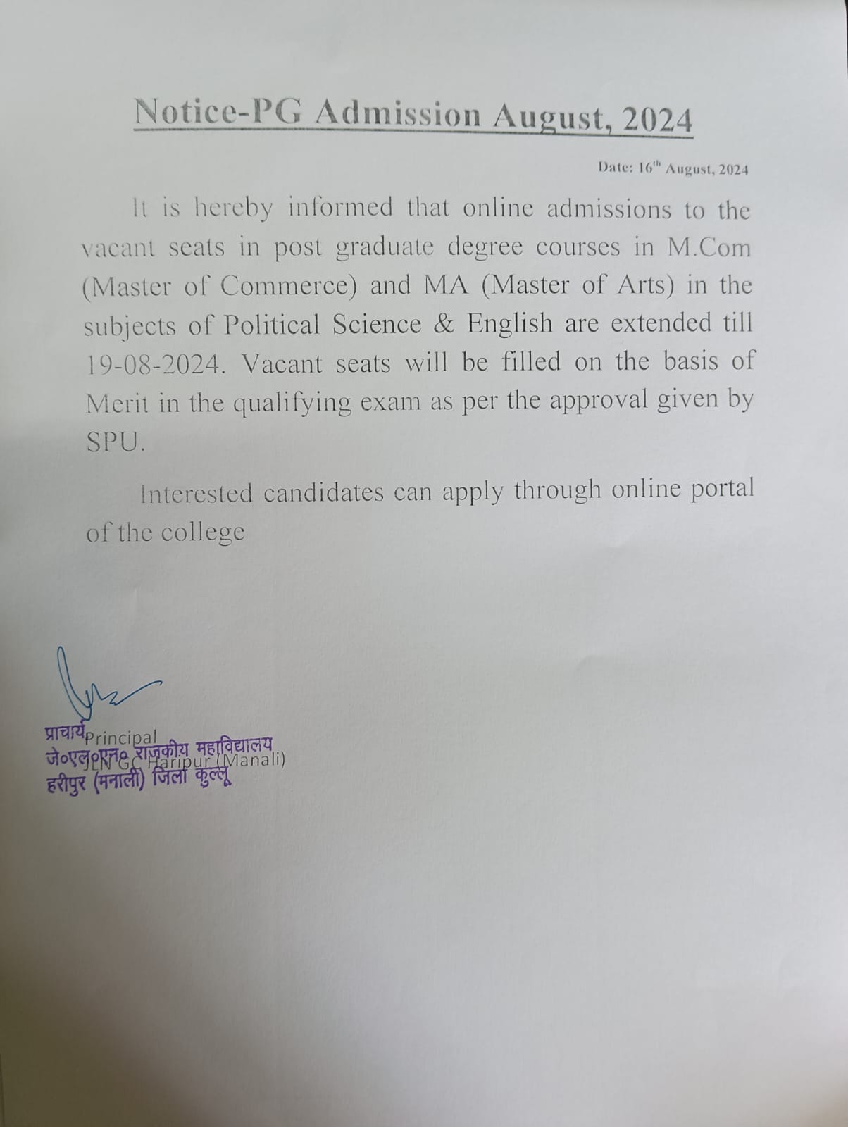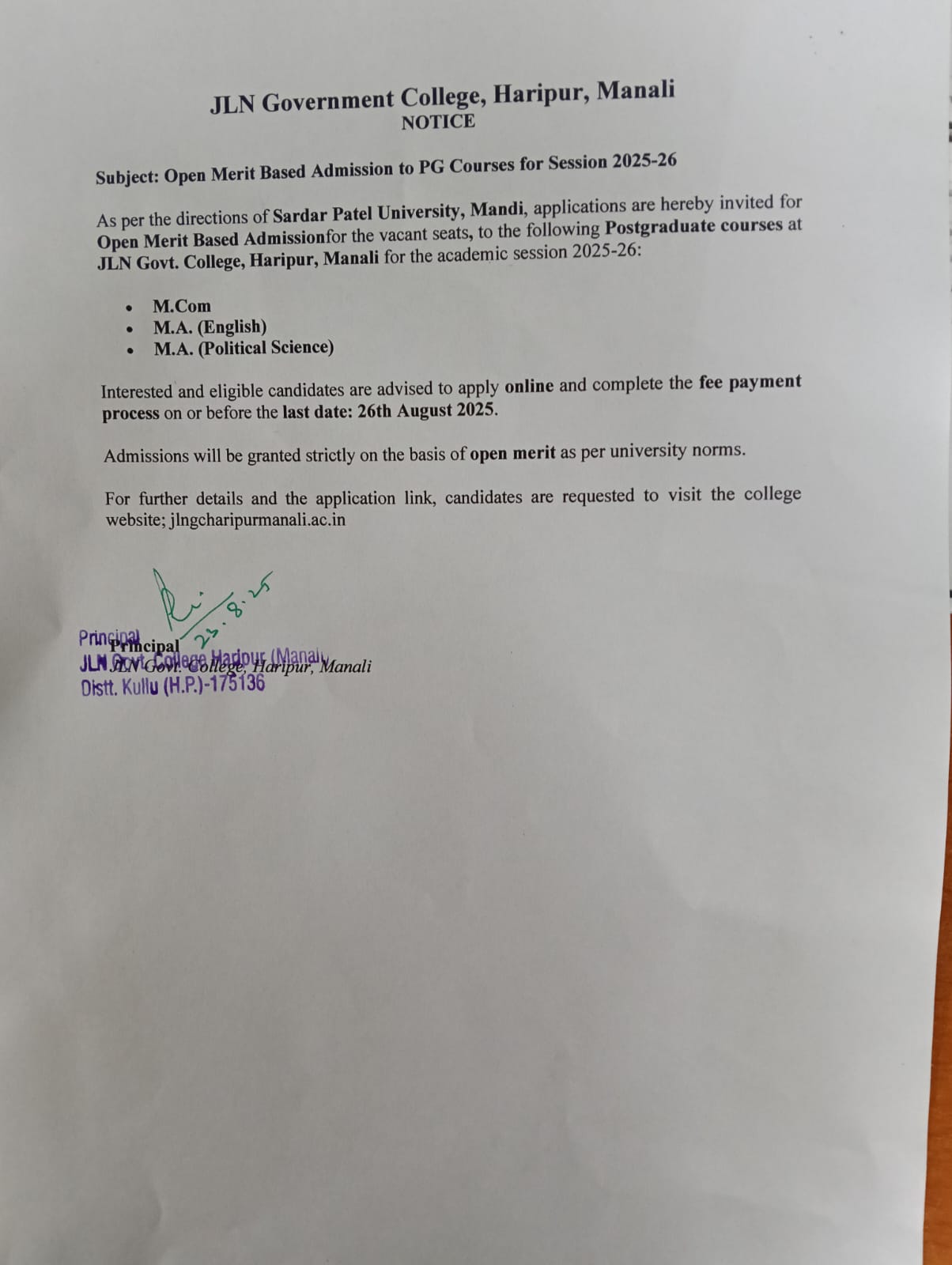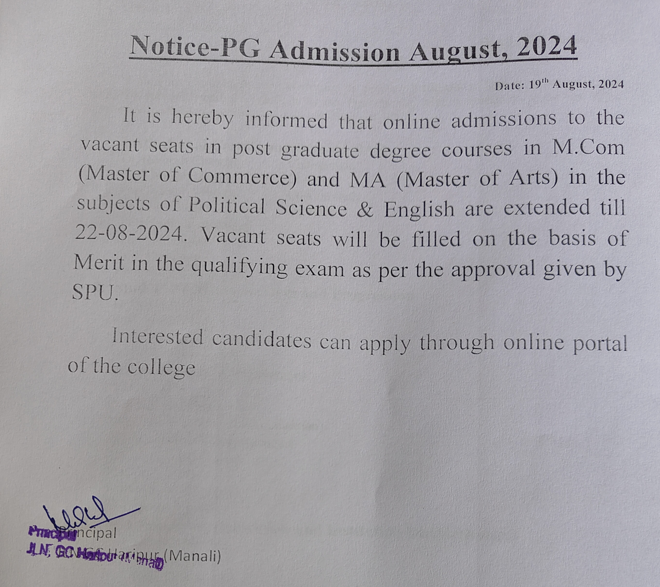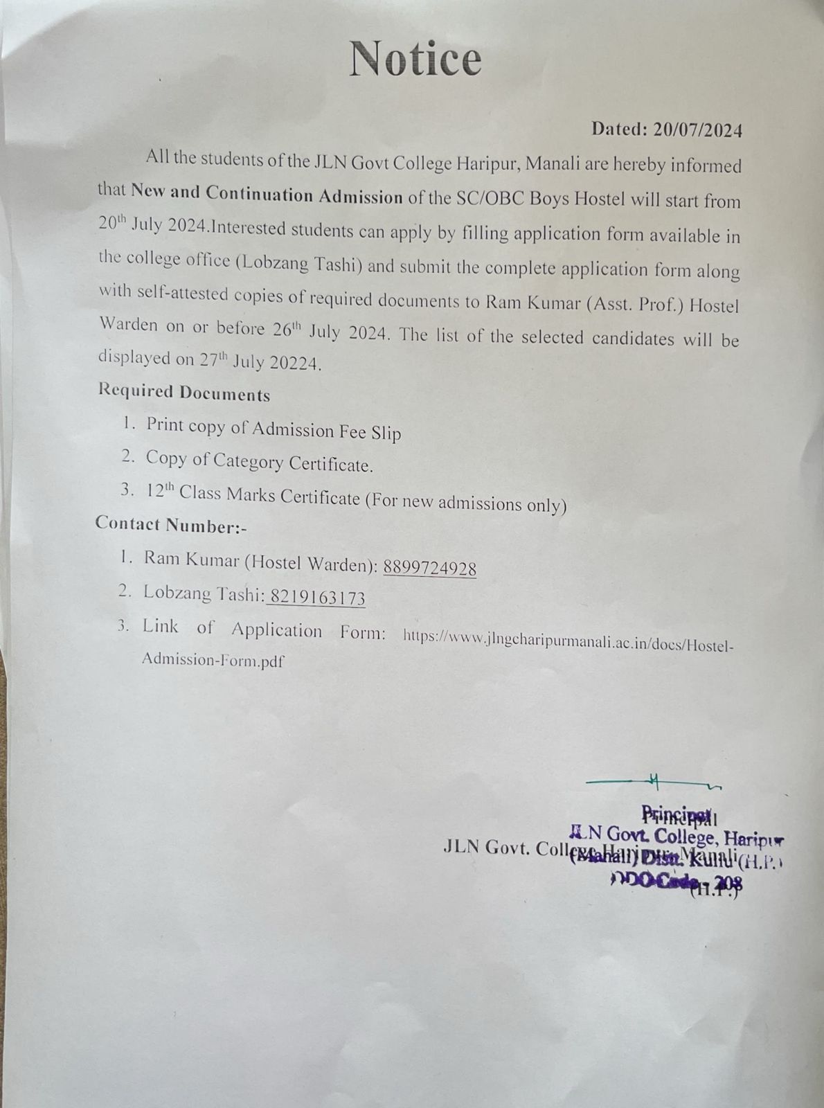 Notice Regarding Admission Form of JLNGC Boys Hostel Haripur Manali.