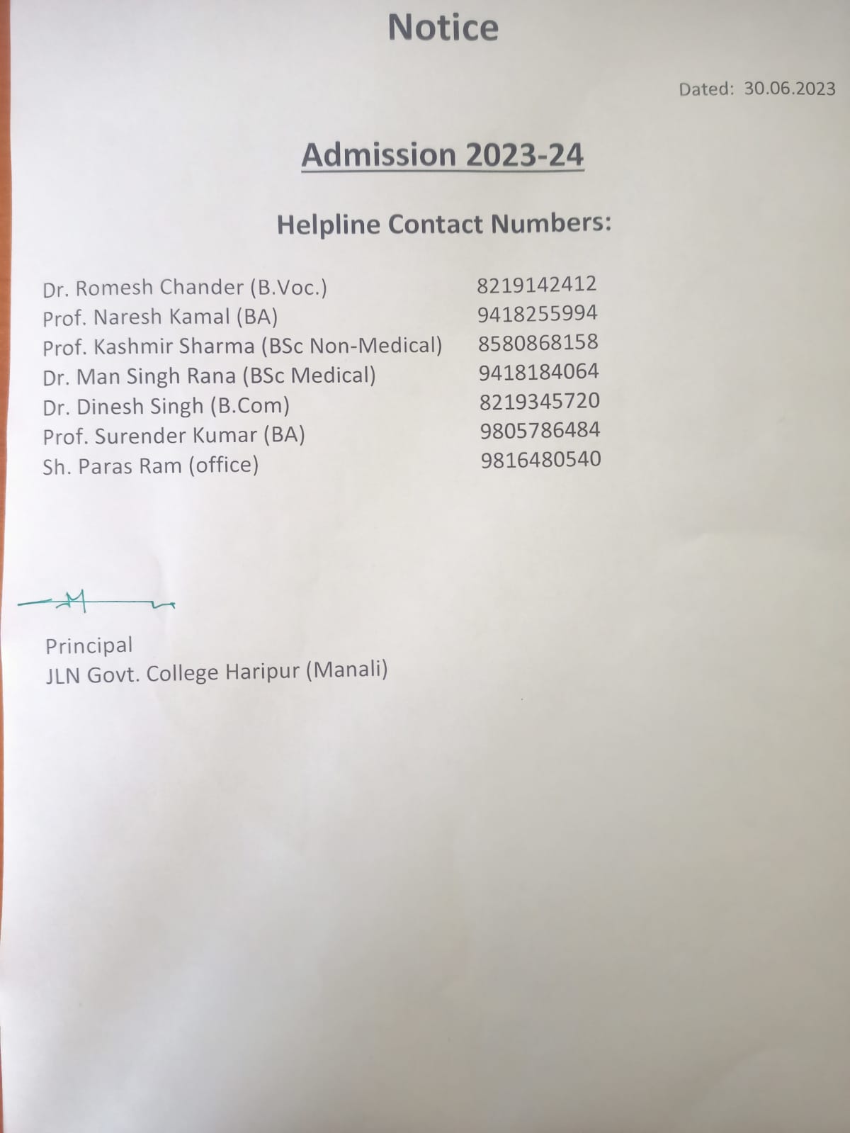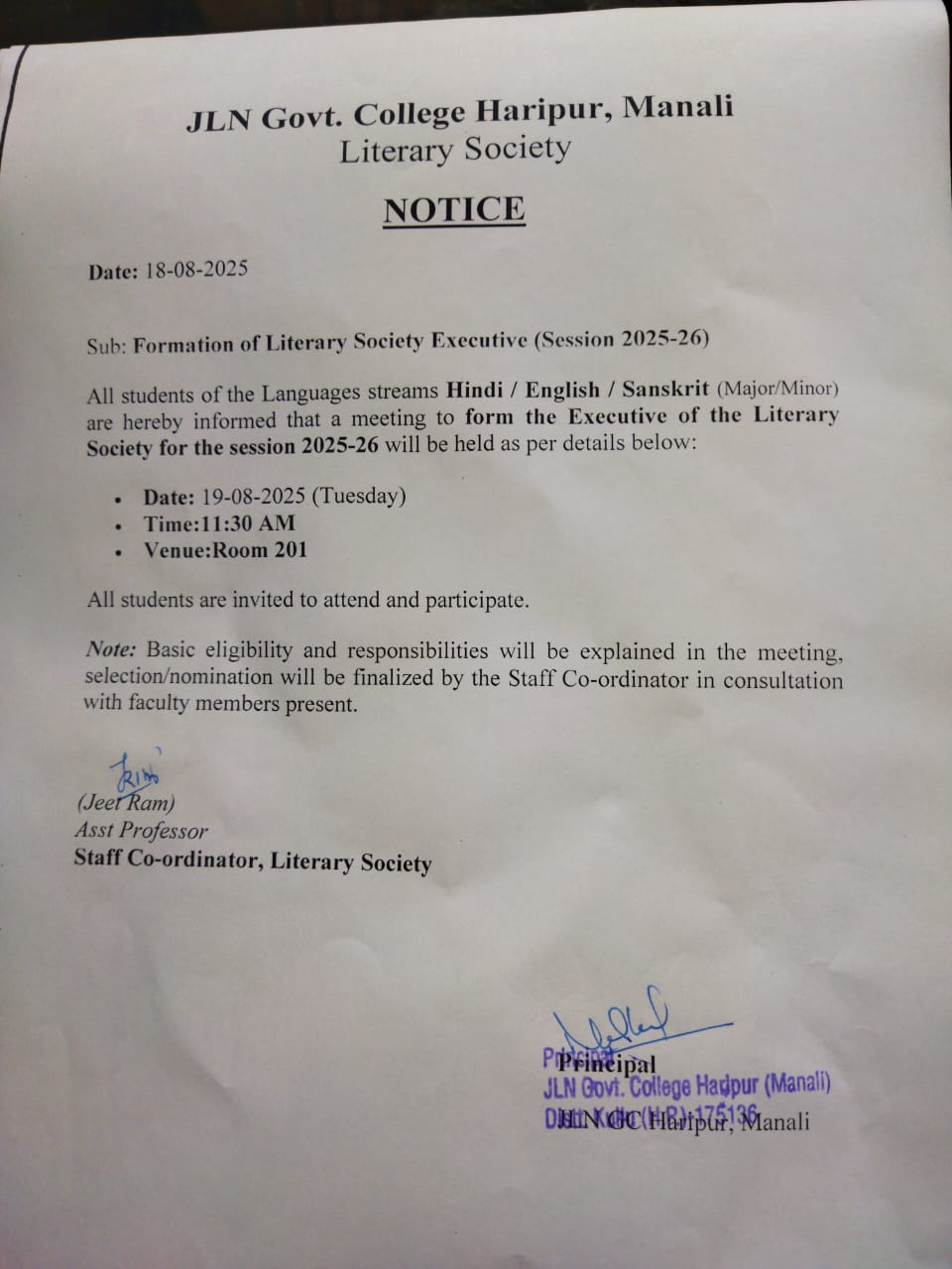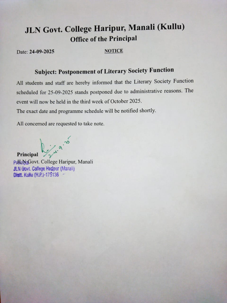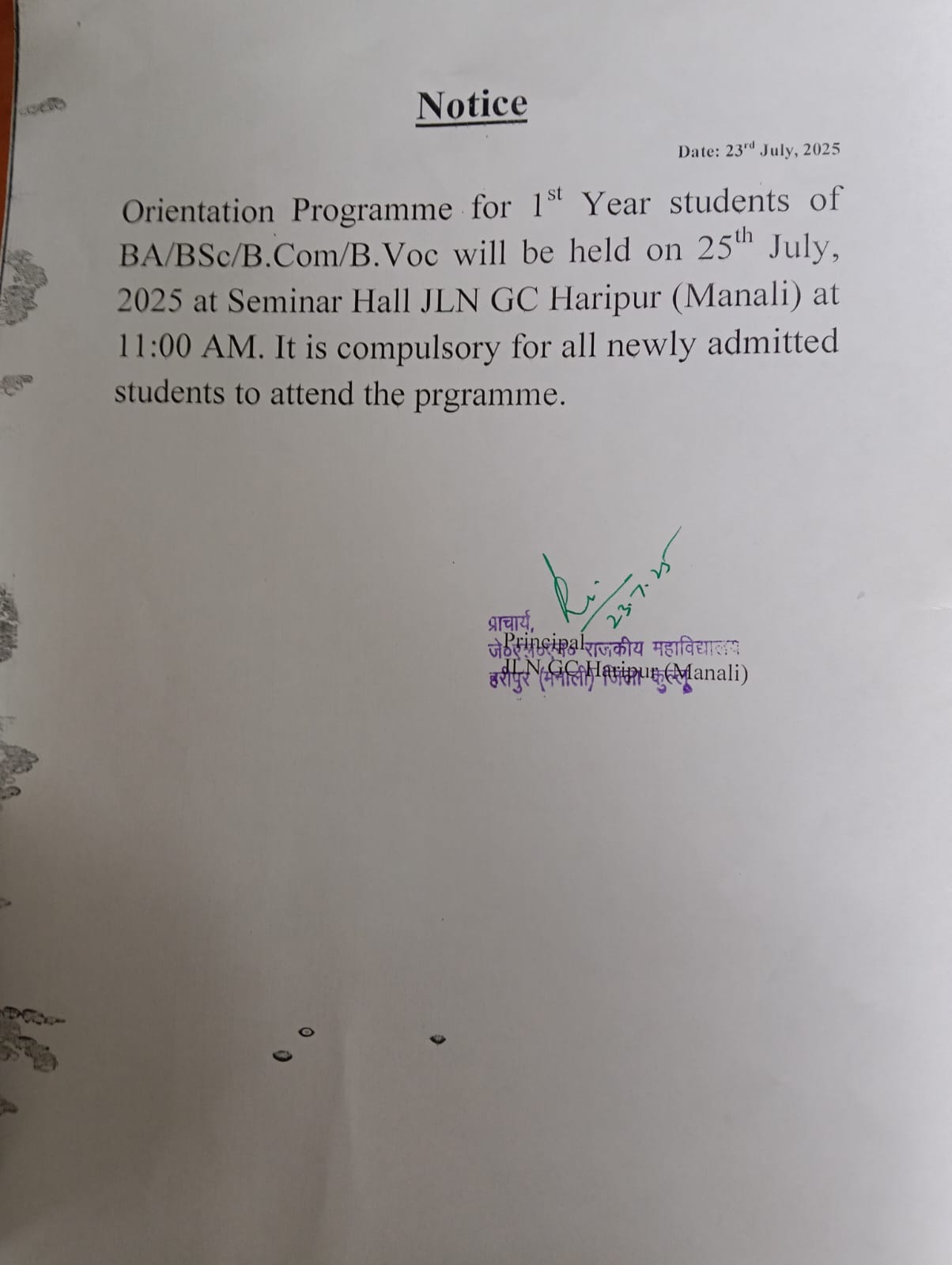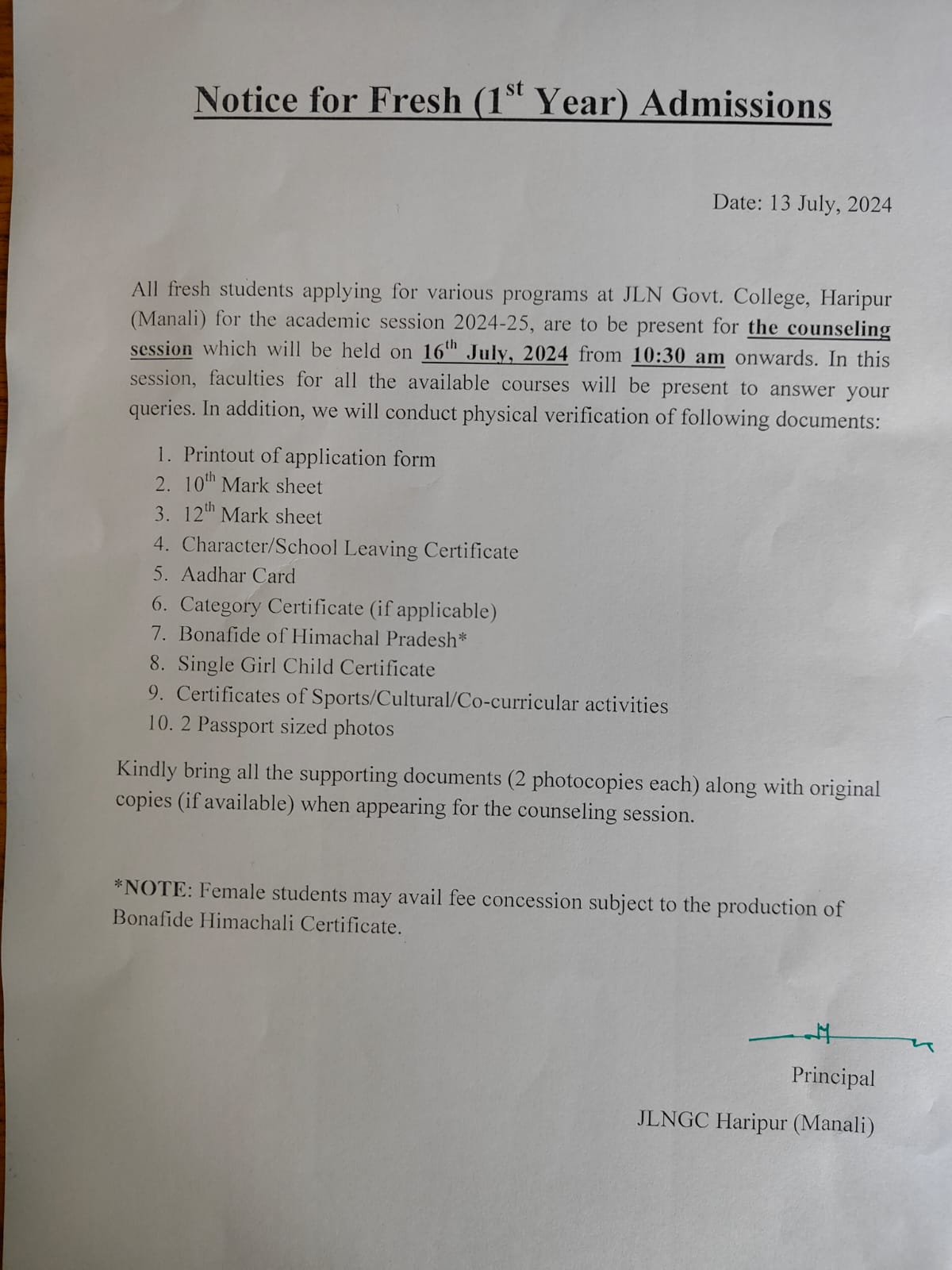 Notice Regarding Admission Form of JLNGC Boys Hostel Haripur Manali.