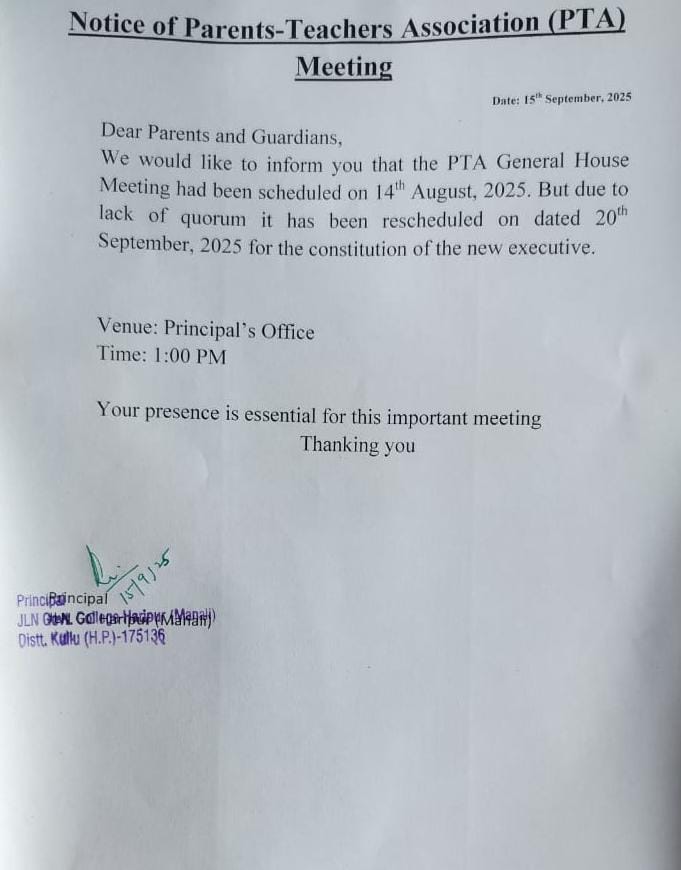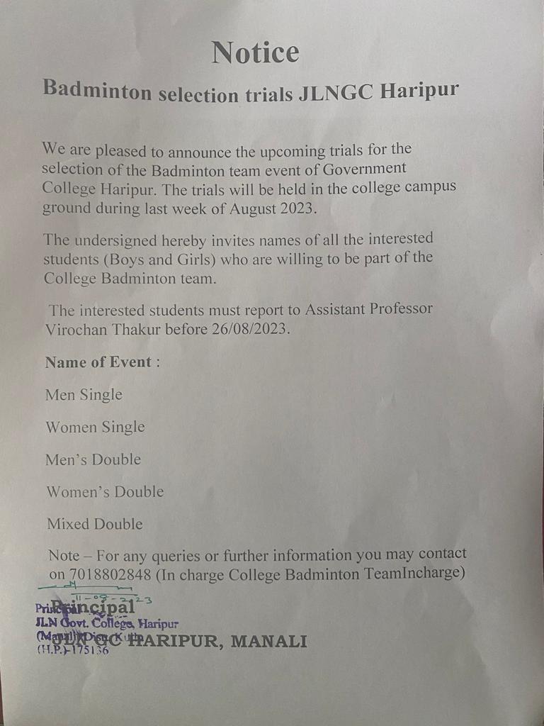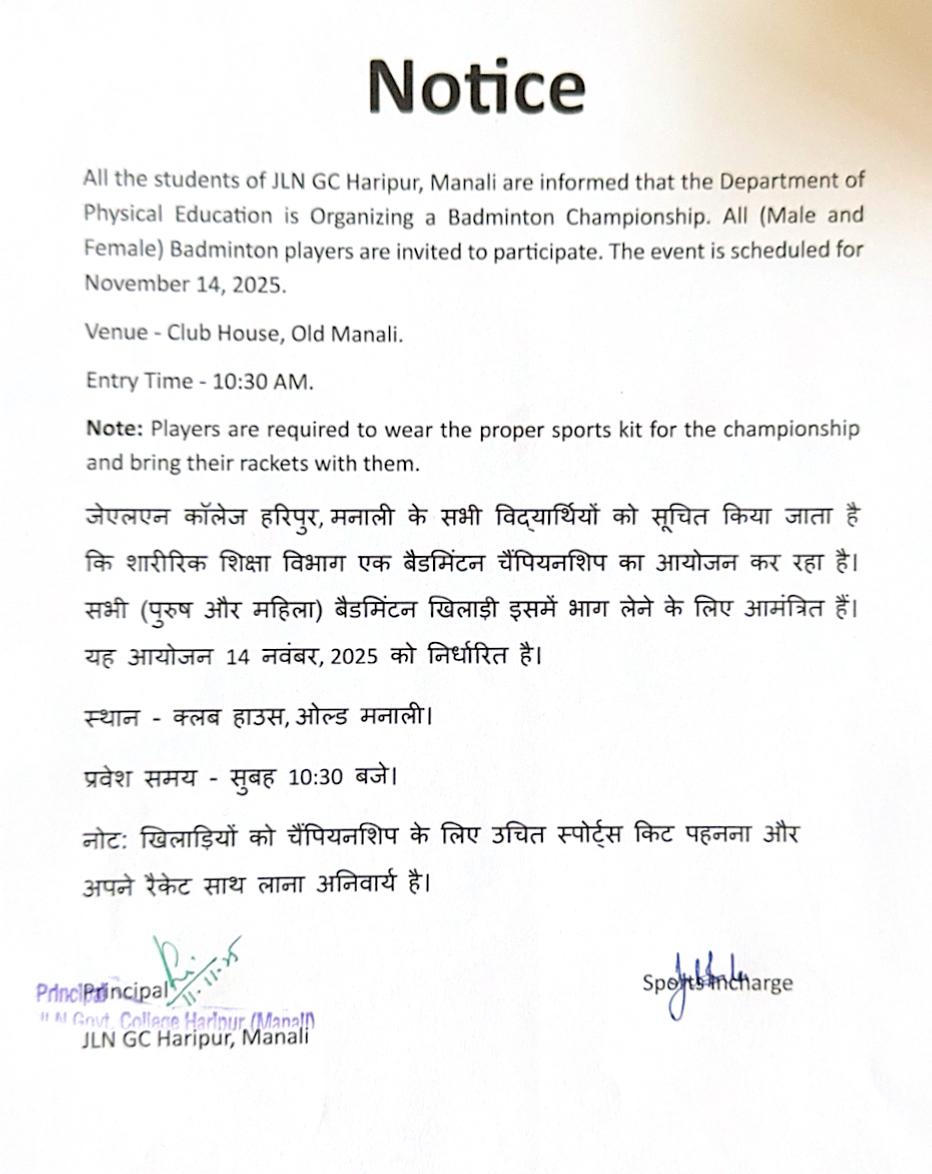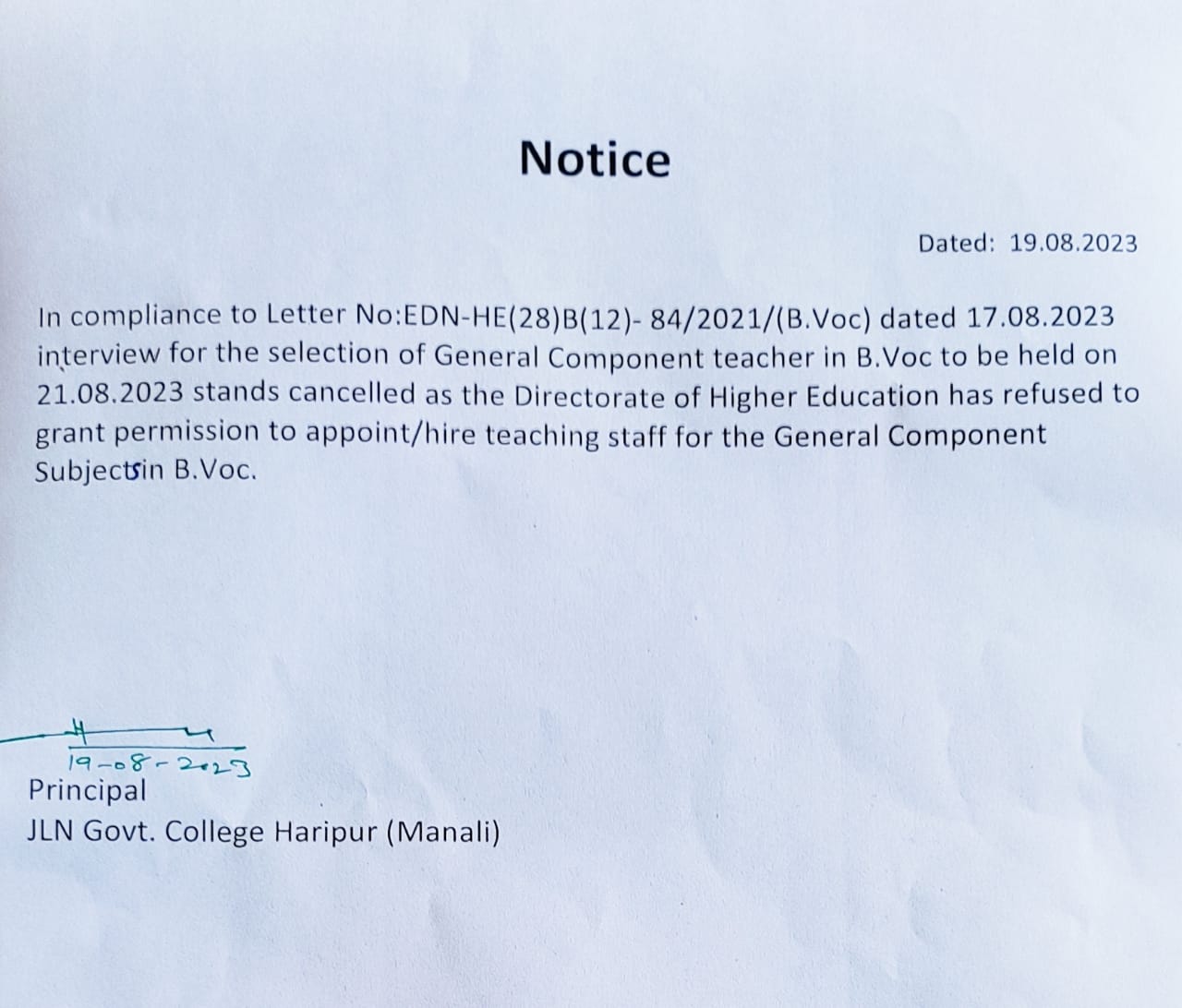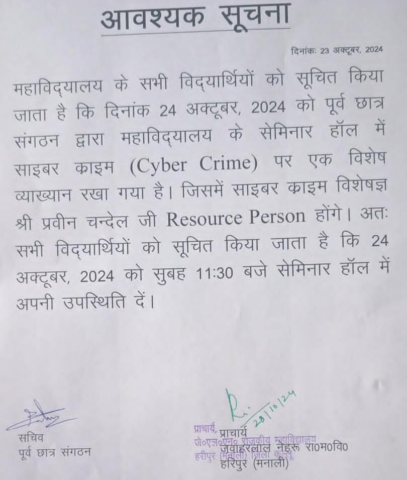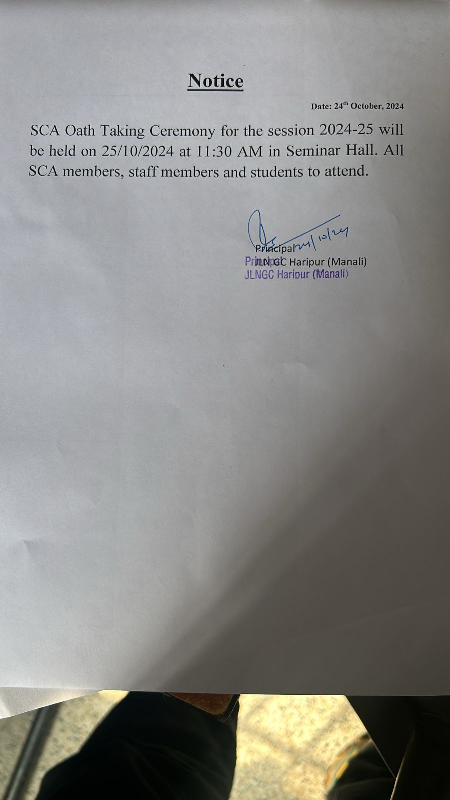 Notice Regarding Admission Form of JLNGC Boys Hostel Haripur Manali.