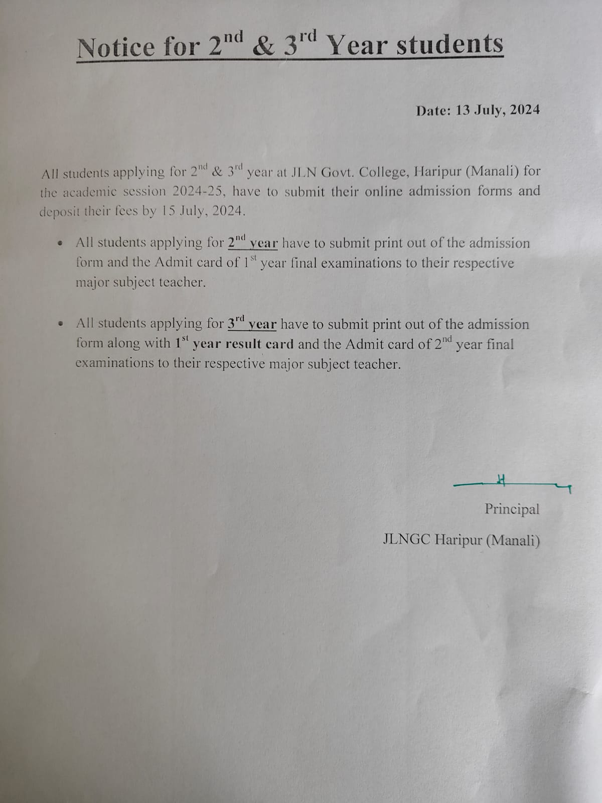 Notice regarding submission of Online Admission Forms and Fee for 2nd and 3rd year students